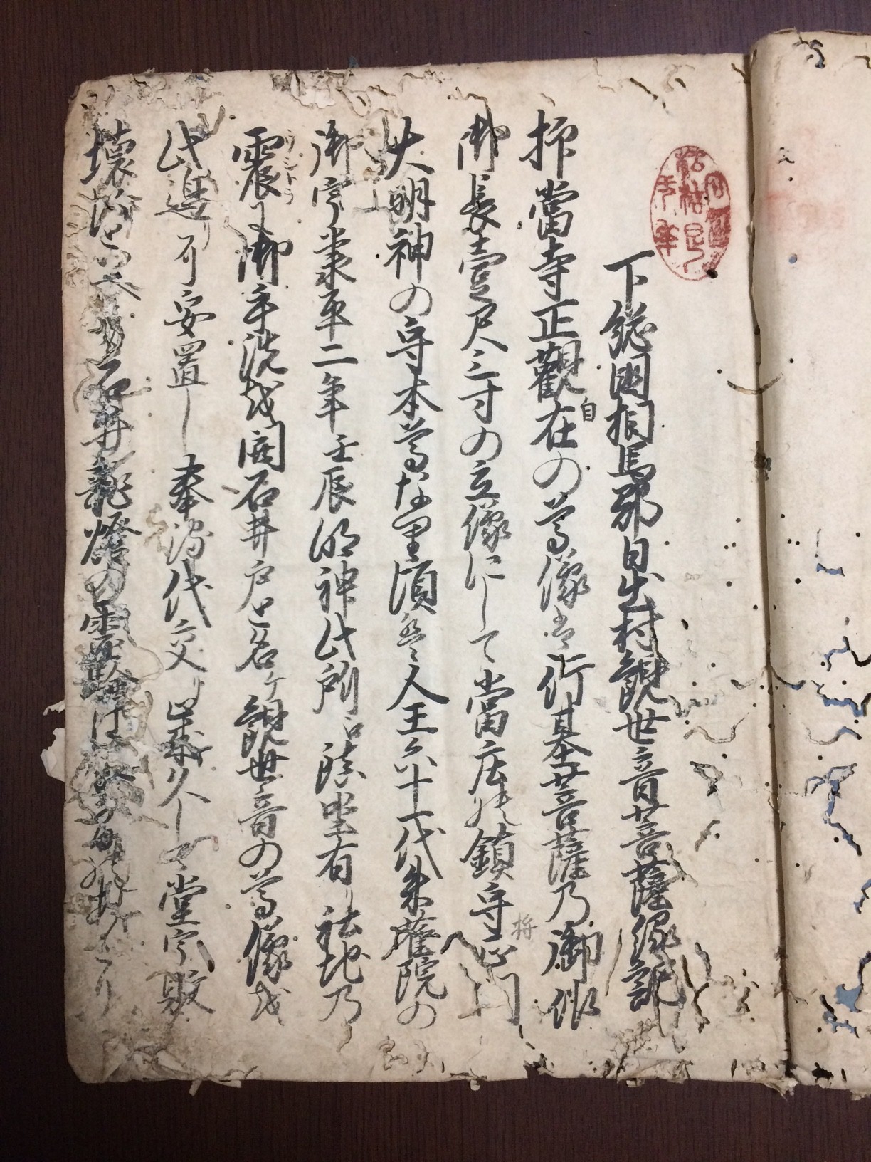 観音寺のご本尊様は本堂にお祀りする「お釈迦様」ですが、国道沿いの大きな屋根のお堂は観音堂で、「聖観世音菩薩」(観音さま)をお祀りしています。この観音さまは平将門の守本尊と伝えられ信仰されています。謂れについては「下総国相馬郡日出村観世音菩薩縁起」があり、それによれば行基菩薩の作と記されています。全体の読み下し、訳文をご紹介します。どちらも住職の独断ですので誤りがあるかもしれません。ご教示をお願いします。
